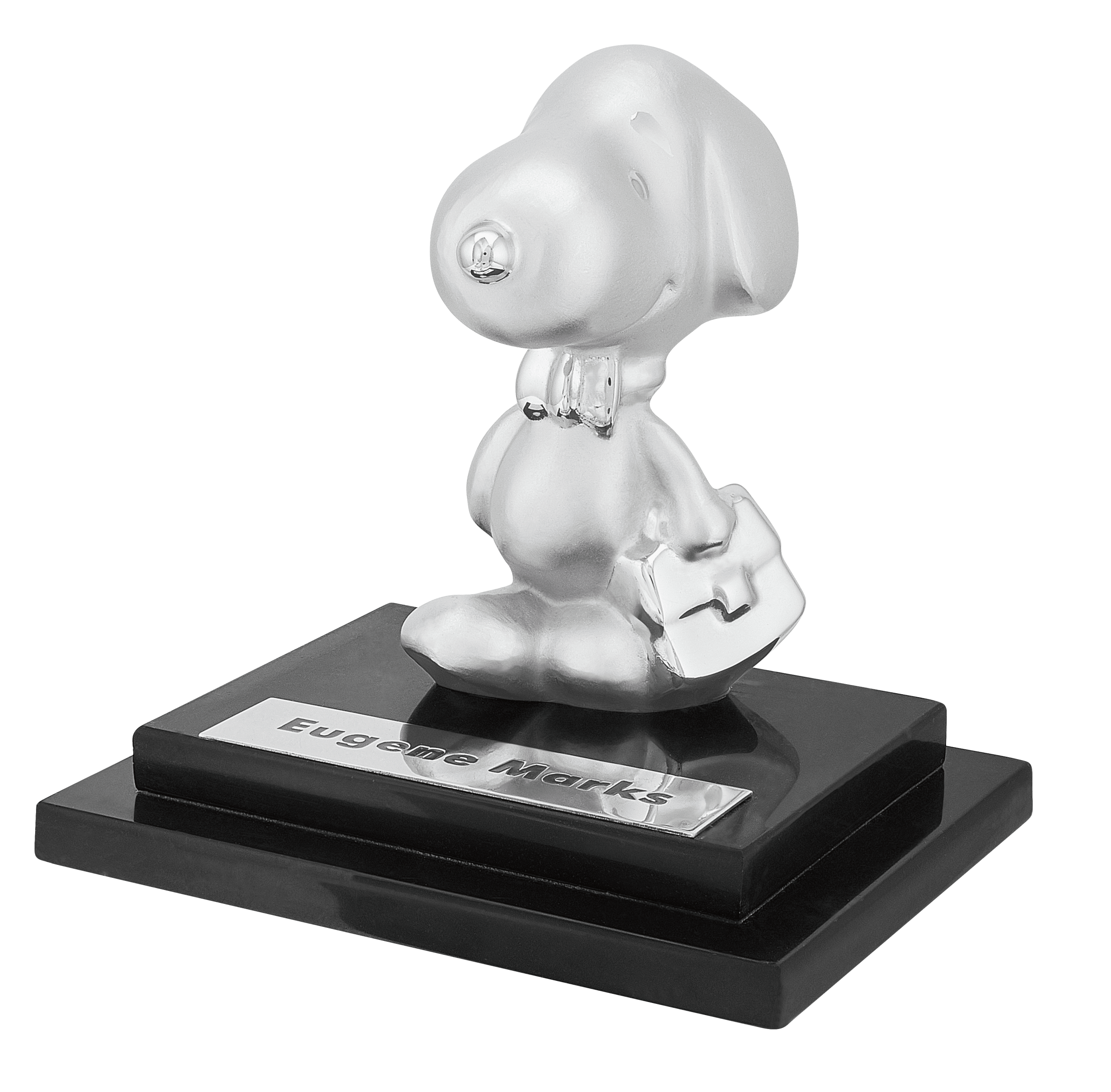 Escultura vaciada a la cera perdida en alto relieve en metal rex con baño níquel de 95mm de altura montada en base de mármol negro de dos niveles con placa para personalizar
