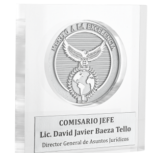 Reconocimiento con moneda vaciada a la cera perdida en alto relieve en metal rex baño níquel con medida 40mm montada en acrílico de 90×80 mm
