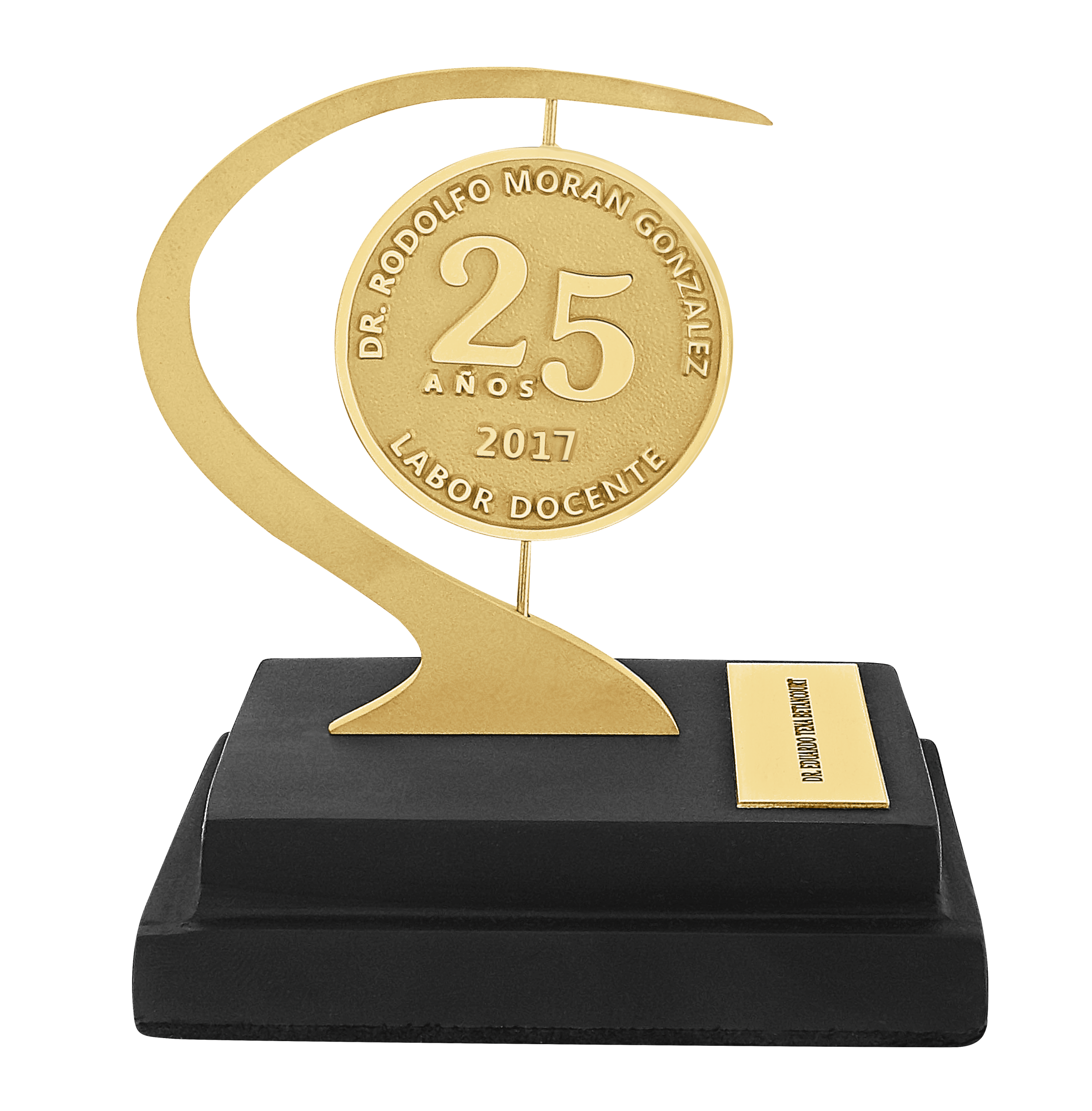 Moneda Giratoria vaciada a la cera perdida en alto relieve en metal rex con baño de oro medida de 45mm de diámetro montada en base de mdf negro de dos niveles con placa para personalizar