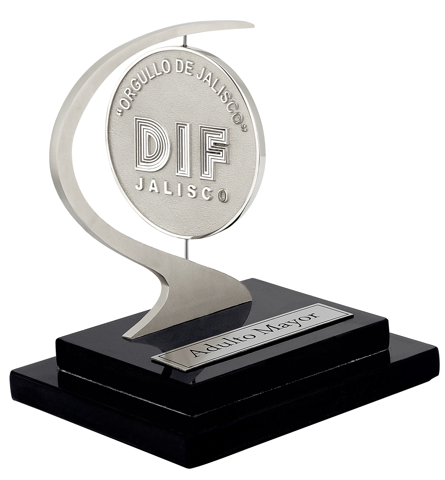 Moneda giratoria vaciada a la cera perdida en alto relieve en metal rex con baño de níquel con medida de 70mm de diámetro montada en base de mármol negro de dos niveles con arco modernista y placa personalizada