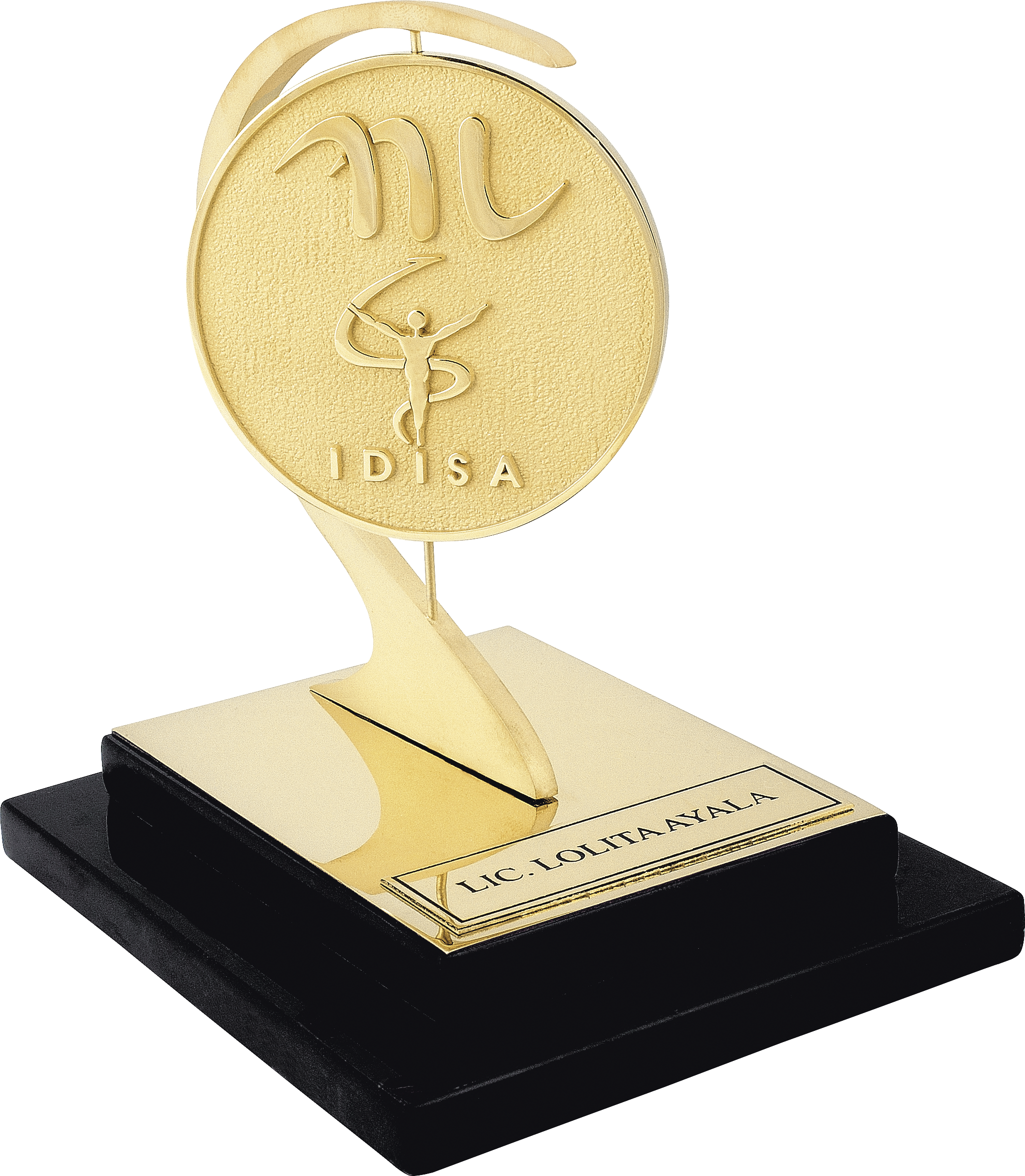 Moneda giratoria vaciada a la cera perdida en alto relieve en metal rex con baño oro medida de 70 mm, montada en base de mármol negro de dos niveles con placa personalizada