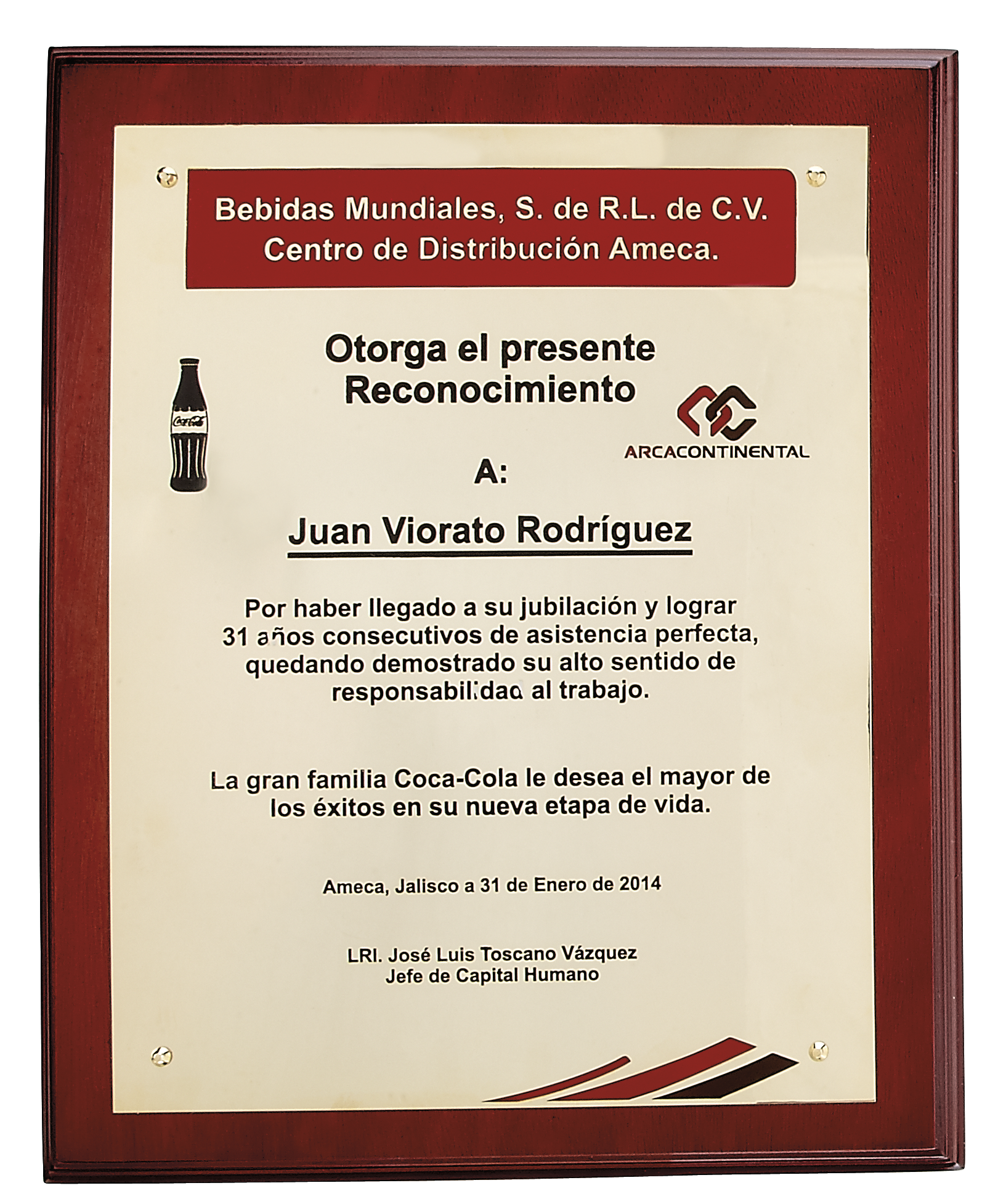 Reconocimiento en acero fotograbado con medida de 26x33cm con placa en laton de 28x21cm