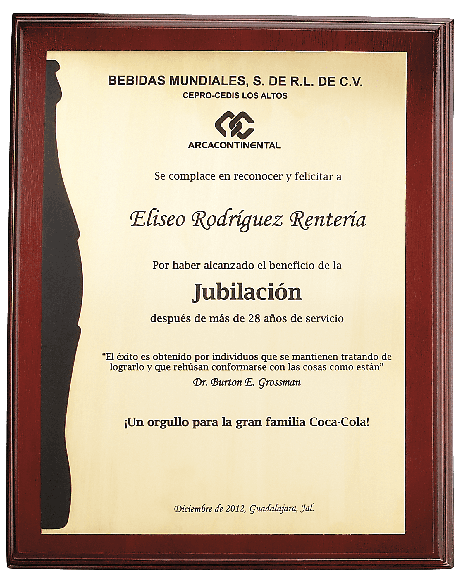 Reconocimiento en acero fotograbado con medida de 26X33cm con placa en alaton de 28x21cm