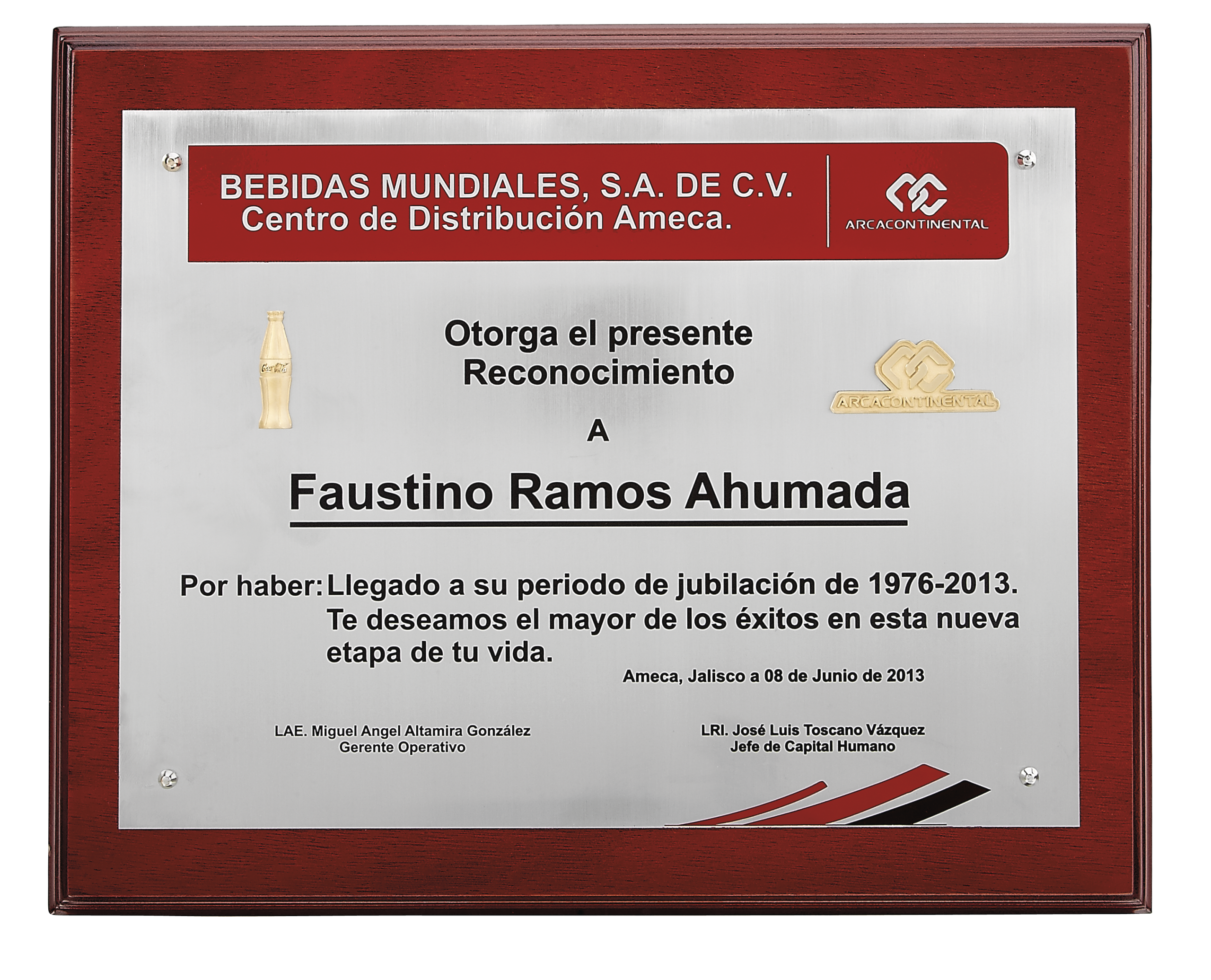 Reconocimiento en acero fotograbado con medida de 26x33cm con placa en acero de 28x21cm, con dos pines de 2.0 cm en metal rex baño oro