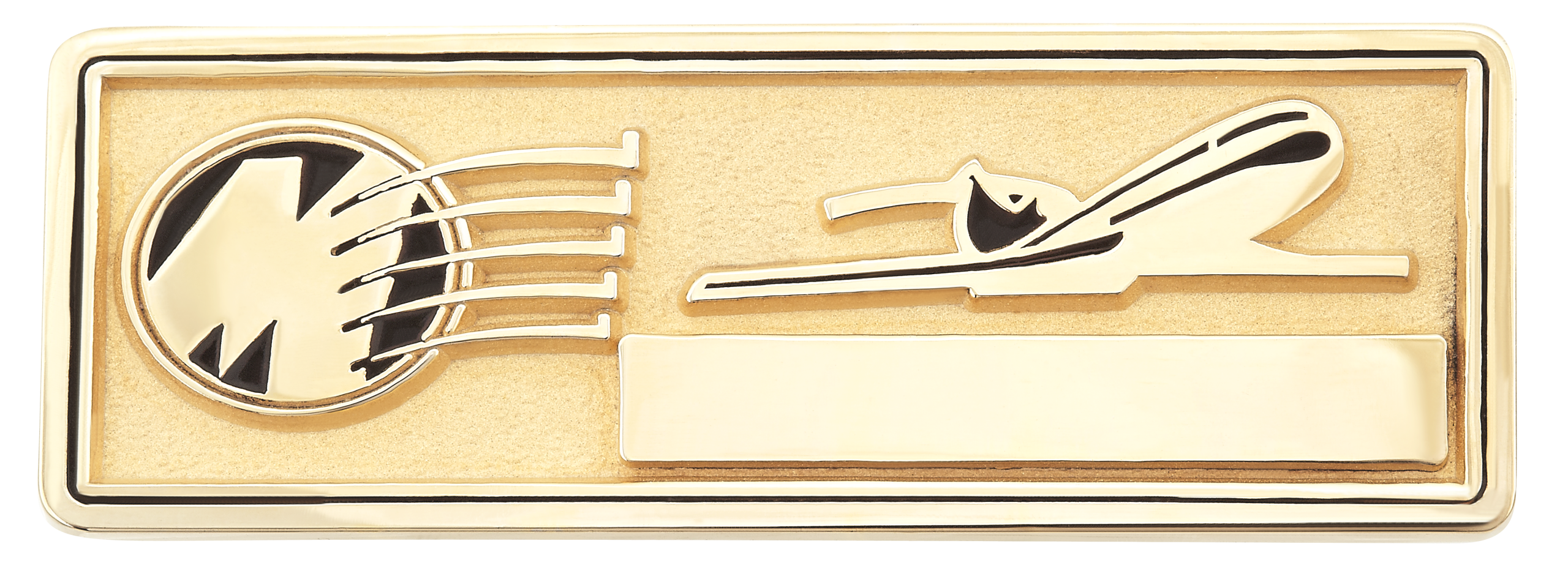 Gafete vaciado a la cera perdida en alto relieve medida de 80x28mm en metal rex con baño oro y aplicación de tintas y broche de imán