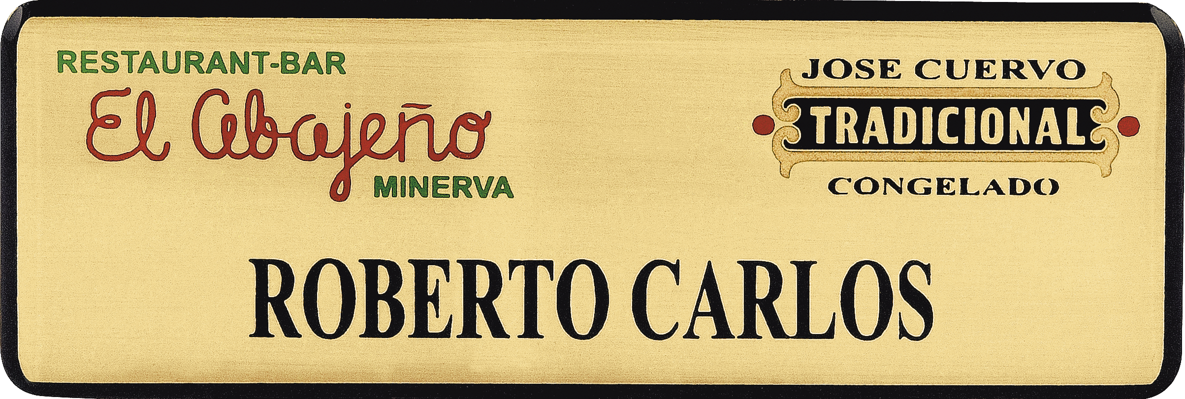 Gafete fotoimpreso en latón con medida de 80x28mm con resina con broche de imán