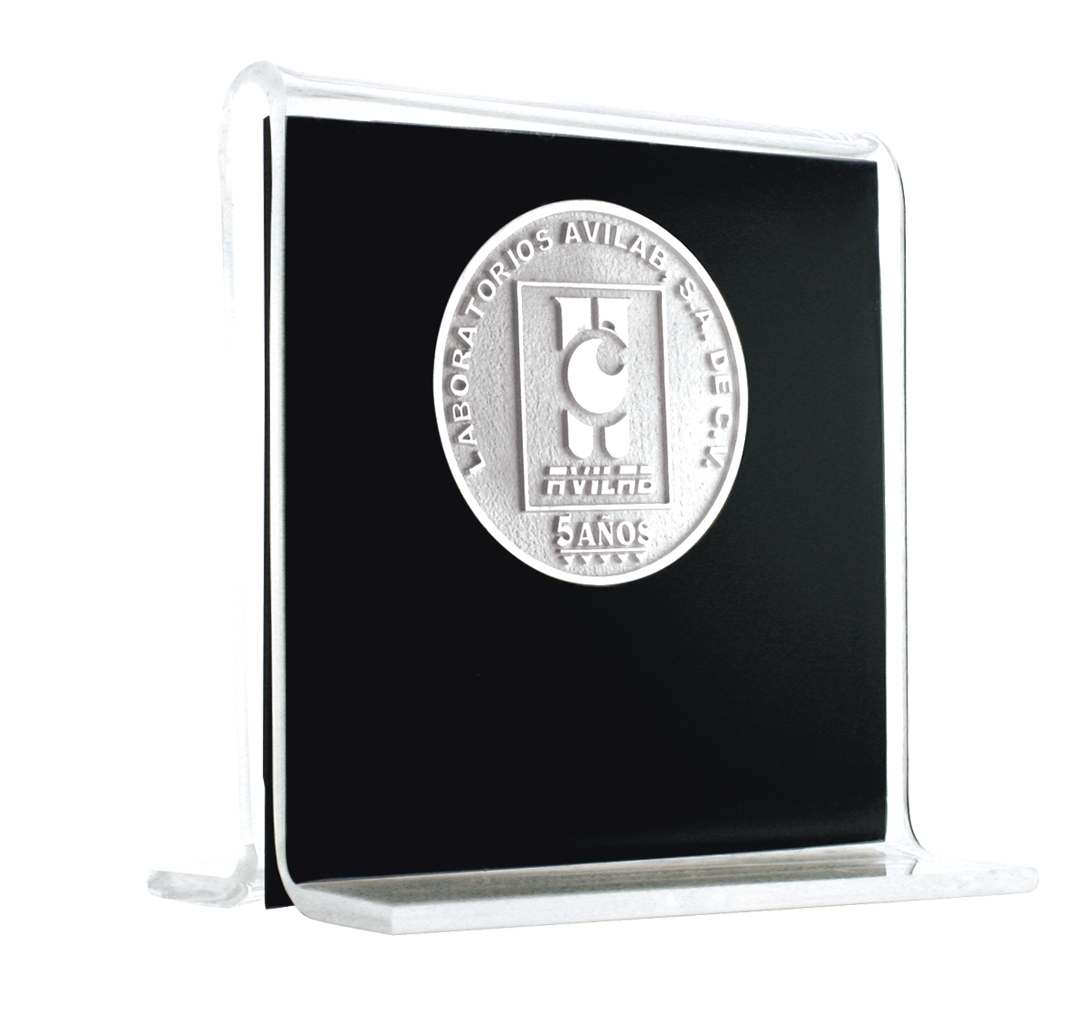 Reconocimiento con moneda vaciada a la cera perdida en alto relieve en metal rex baño níquel con medida 40mm montada en acrílico de 90×80 mm