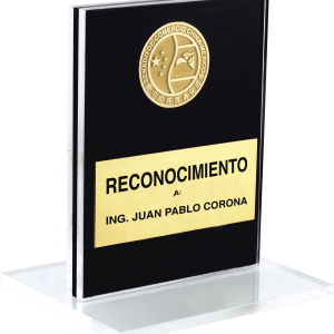 Reconocimiento en cubo de acrílico transparente con medida de 97x87x15 mm con moneda vaciada a la cera perdida en alto relieve a dos caras en metal rex baño níquel con medida de 55mm con placa para personalizar