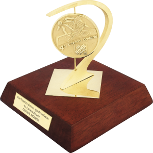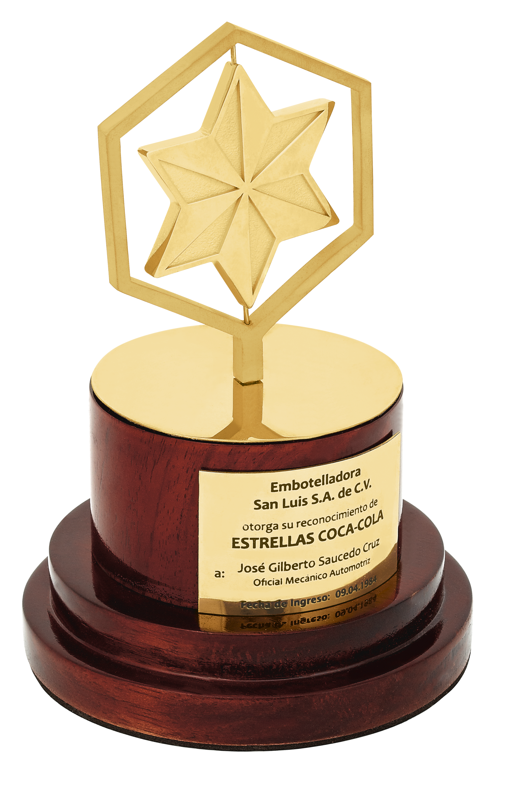 Moneda giratoria vaciada a la cera perdida en alto relieve en metal rex con baño de oro con medida de 60 mm, arco giratorio hexagonal, montada en base de madera 3 niveles con placa personalizada
