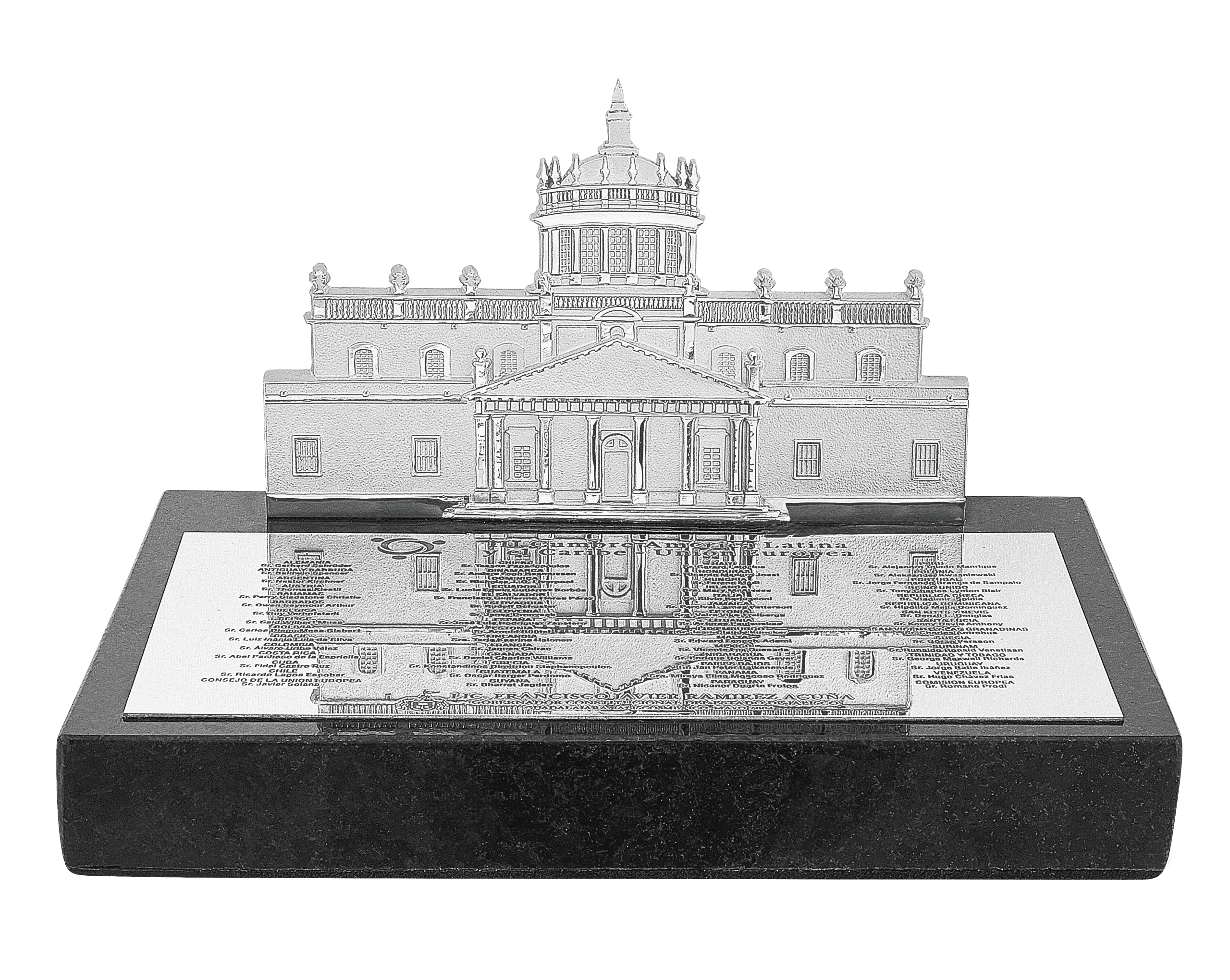 Reconocimiento con moneda a una cara vaciada a la cera perdida en alto relieve en metal rex terminado níquel con medida de 115×65 mm, montada sobre base de mármol negro de 160x120x20 mm con placa para personalizar